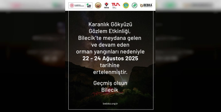Bursa Eskişehir Bilecik Kalkınma Ajansı (BEBKA), Bilecik ve Eskişehir'deki orman yangınları nedeniyle 25-27 Temmuz 2025'te yapılması planlanan Harmankaya Kanyonu Karanlık Gökyüzü Gözlem Etkinliği'ni 22-24 Ağustos 2025'e ertelediğini açıkladı.