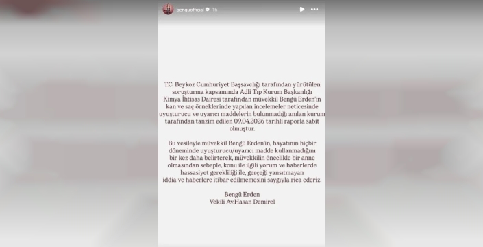 Adli Tıp Kurumu'nda yapılan testlerin sonuçları belli oldu. Bengü, avukatı aracılığıyla sosyal medya hesabından yaptığı paylaşımda, kan ve saç örneklerinde uyuşturucu veya uyarıcı maddelerin bulunmadığını duyurdu. Açıklamada, bu sonuçların T.C. Beykoz Cumhuriyet Başsavcılığı tarafından yürütülen soruşturma çerçevesinde elde edildiği belirtildi.