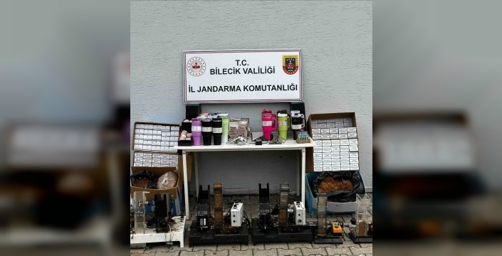 Bilecik İl Jandarma Komutanlığı Kaçakçılık ve Organize Suçlarla Mücadele (KOM) Şube Müdürlüğü ve Söğüt İlçe Jandarma Komutanlığı ekipleri, ilçede belirlenen üç ayrı adrese eş zamanlı operasyon düzenledi. Yapılan aramalarda 3 tabanca kabzası, 2 tabanca üst kapak takımı, 2 tabanca şarjörü, 1 namlu, 1 kabza koruyucu, 2 tetik tertibatı, 12 kuru sıkıdan bozma fişek, 23 adet tabanca mermisi, 42 bin 600 boş makaron, 12 makaron doldurma aparatı, 5 makaron doldurma makinesi, 520 boş sigara kutusu, 22 bin 460 gram açık tütün, 32 adet 1,18 litre termos, 2 adet termos, 30 adet bardaklı termos seti, bin 860 dolu makaron ve nane aromalı 4240 kapsül kapasiteli aroma kapsülü ele geçirildi.