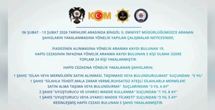 Bingöl İl Emniyet Müdürlüğü ekipleri, 6-13 Şubat 2026 tarihleri arasında il genelinde yürüttükleri kapsamlı operasyonlarda önemli sonuçlar elde etti. Bu operasyonlar kapsamında, aranan şahısların yakalanmasına yönelik çalışmalarda toplam 24 kişi gözaltına alındı. İfadesinin alınması için aranan 19 kişi ile hapis cezasının infazı için aranan 5 kişi, adli işlemlere tabi tutuldu.