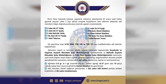 Bingöl'de düzenlenen uyuşturucu operasyonunda, çok miktarda uyuşturucu ve silah ele geçirilirken, iki şüpheli tutuklandı. Operasyon, Genç ilçesinde bir aracın şüpheli hareketleri üzerine başlatıldı.