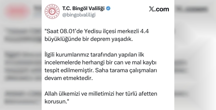 Bingöl, sabah saatlerinde meydana gelen 4.4 büyüklüğündeki depremle sarsıldı. Merkez üssü Yedisu ilçesi olan sarsıntının ardından Bingöl Valiliği'nden yapılan ilk açıklamalar yüreklere su serpti. Yapılan ilk incelemelerde herhangi bir can veya mal kaybının yaşanmadığı bildirildi.