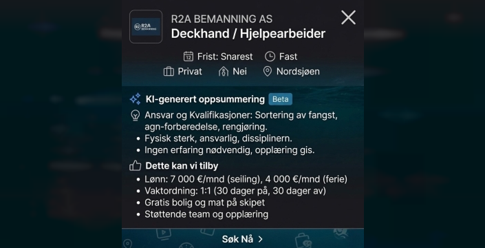 Norveçli R2A Bemanning AS, Kuzey Denizi'nde çalışacak deneyimsiz güverte görevlilerine ayda 367 bin TL maaş ve 1 ay çalışıp 1 ay tatil imkanı sunuyor. Tüm masraflar şirket tarafından karşılanacak.