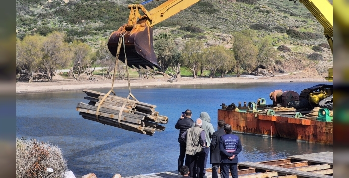 Yalıkavak Mahallesi'nde yer alan Küdür Yarımadası'nda başlatılan yıkım çalışmaları, Bodrum Kaymakamlığı koordinesinde yürütülüyor. Bölge Liman Başkanı Tuncay Aydın, Milli Emlak Müdürlüğü ve Bodrum Belediyesi Zabıta Müdürlüğü ekipleri, sabahın erken saatlerinde bölgeye intikal etti. Ekipler, ilk olarak Eski Deve Güreşi Alanı'ndaki iskelenin tahtalarını söktü. Ardından, yüzer platform üzerinde getirilen iş makineleriyle iskele kontrollü bir şekilde yıkıldı.