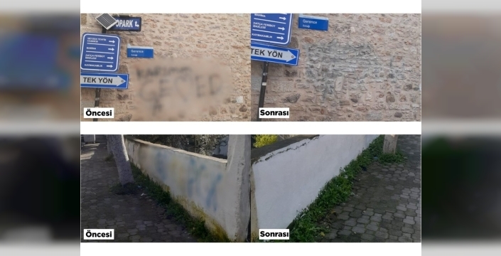 Temizlenen ve yeniden boyanan alanlar, kent estetiğine uygun bir görünüm kazanıyor. Belediye ekipleri, daha düzenli, temiz ve sürdürülebilir bir kent yaşamı sağlamak amacıyla çalışmalarına devam edecek. Bodrum Belediye Başkanı Tamer Mandalinci, kent sakinlerinden kamuya ait alanlara yazı yazmamalarını, boyama veya kazıma işlemleri yapmamalarını rica ederek,