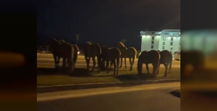 Refüjdeki çimleri yiyerek karınlarını doyuran atlar, zaman zaman yola yaklaşarak trafikte tehlike oluşturdu. Güzergahı kullanan sürücüler, atlara çarpmamak için hızlarını düşürerek kontrollü şekilde ilerledi. Bir süre orta refüjde otlayan atlar, daha sonra bölgeden uzaklaşarak gözden kayboldu.