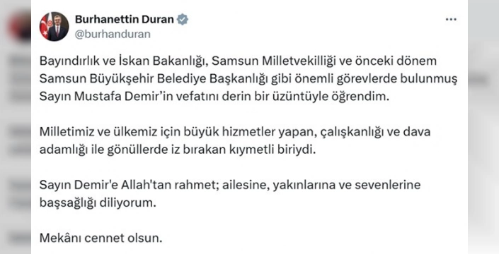 Cumhurbaşkanlığı İletişim Başkanı Burhanettin Duran, eski Bakan ve Samsun Büyükşehir Belediye Başkanı Mustafa Demir'in vefatı üzerine taziye mesajı yayımladı. Duran, Demir'e Allah'tan rahmet diledi ve ailesine başsağlığı dileklerini iletti.