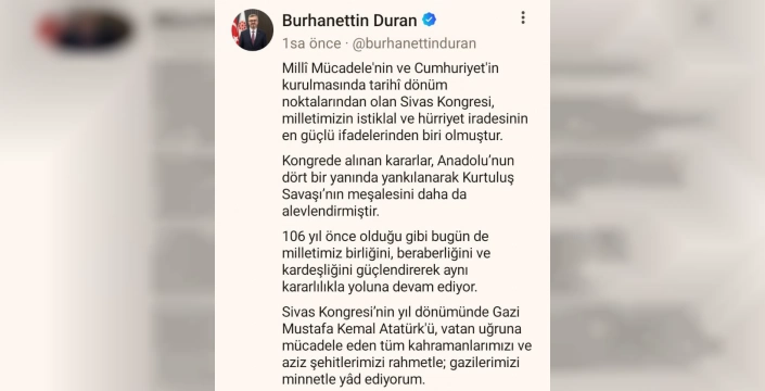 Duran, mesajında şu ifadeleri kullandı: '106 yıl önce olduğu gibi bugün de milletimiz birliğini, beraberliğini ve kardeşliğini güçlendirerek aynı kararlılıkla yoluna devam ediyor. Sivas Kongresi’nin yıl dönümünde Gazi Mustafa Kemal Atatürk’ü, vatan uğruna mücadele eden tüm kahramanlarımızı ve aziz şehitlerimizi rahmetle; gazilerimizi minnetle yad ediyorum.'