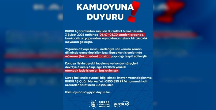 Bursa'da 3 Şubat 2026'da bankacılık altyapı sorunu nedeniyle BursaKart'lardan mükerrer çekimler yapıldı. BURULAŞ, tüm fazla tutarların iade edileceğini ve detaylı bilgi için çağrı merkezinin aranabileceğini duyurdu.