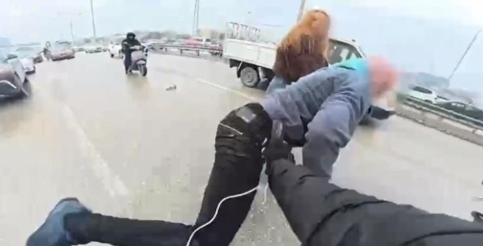 Bursa’da iki sürücü arasında ‘yol verme’ tartışması sonucu çıkan kavgada, tarafların birbirine uçan tekmeyle saldırdığı anlar kameraya yansıdı.