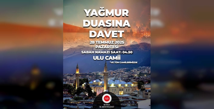 Pazartesi sabahı, Bursa Ulu Camii başta olmak üzere tüm camilerde, Bursa ve ülkenin çeşitli bölgelerindeki kuraklık ve susuzluk için yağmur duası düzenlenecek. Bursa Müftülüğü, sosyal medya hesabından yaptığı açıklamada, 'Toprağın çatladığı, ormanlarımızın yandığı, tarlaların susuz kaldığı bu günlerde; rahmetin inmesi, bereketin gelmesi için eller semaya, gönüller duaya açılıyor. Kuraklığın pençesindeki şehirlerimizde, milletçe aynı niyazla kenetleniyor, rahmet ve bereket için yalvarıyoruz. Yağmur için dua vaktidir.' ifadelerini kullandı.
