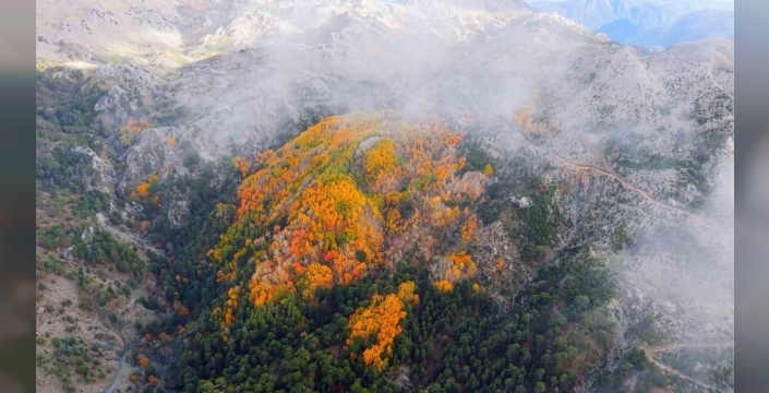 Denizli'nin Çameli ilçesi, zengin florası ve yüksek endemik tür çeşitliliğiyle öne çıkıyor. İlçenin en dikkat çekici doğal güzelliklerinden biri olan titrek kavak ormanları, özellikle sonbahar ve kış aylarında ziyaretçilerine büyüleyici bir görsel şölen yaşatıyor. Sarıdan kahverengiye uzanan geniş bir renk paletinin hakim olduğu bu ormanlar, adeta doğanın bir tablosunu andırıyor. Bu eşsiz manzara, dron ile havadan görüntülendi.