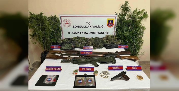 Çaycuma'da adli makamların verdiği arama kararına istinaden yapılan aramada; 53 kök kenevir bitkisi, 6 kök skunk bitkisi, 1597 gram kubar esrar, 45 gram toz esrar, 7 gram kenevir tohumu ve 1 adet esrar öğütme aparatı ele geçirildi. Ayrıca, operasyon sırasında 2 adet muşta, 1 adet ruhsatsız tabanca, 1 adet tabanca şarjörü, 5 adet av tüfeği ve 26 adet 9 mm çapında tabanca fişeği de bulundu.