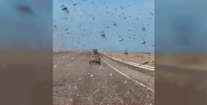 Sahra Çölü'nde dev çekirgelerin karayollarını istila etmesi, trafik akışında büyük aksamalara yol açtı ve sürücülerin görüş mesafesini sıfıra indirdi.