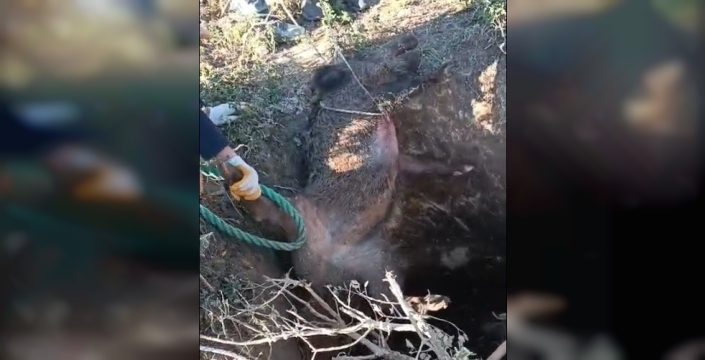 Çeşme'de vatandaşlar, derin bir çukura düşen iki yaban domuzundan birini kurtardı. Talihsiz diğer domuz ise aynı çukurda telef oldu.