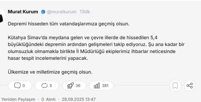 Bakan Kurum, sosyal medya hesabından yaptığı paylaşımda, depremi hisseden tüm vatandaşlara geçmiş olsun dileklerini iletti. Çevre illerde de hissedilen sarsıntının ardından gelişmeleri yakından takip ettiklerini belirtti.