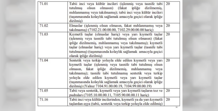 Yapılması planlanan düzenleme ile 4760 sayılı Özel Tüketim Vergisi Kanunu'na ekli (IV) sayılı liste genişletiliyor. Buna göre, inci, elmas ve diğer değerli veya yarı değerli taşlar ile bu taşlardan üretilen ürünler listeye dahil edilecek. Bu ürünlerin ithalatı veya yurt içi satışında yüzde 20 oranında ÖTV alınması hedefleniyor. Mevcut durumda bu ürünler için ÖTV oranı yüzde 0 olarak uygulanıyordu.