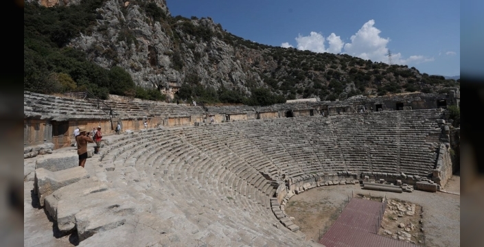 Antalya'nın Demre ilçesindeki Myra Antik Kenti'nde bulunan 11 bin kişilik tiyatronun sahnesi, Kültür ve Turizm Bakanlığı'nın projesiyle restore ediliyor. Prof. Dr. Nevzat Çevik başkanlığındaki kazı ekibi, sahne binasının birinci katını orijinal taşlarıyla