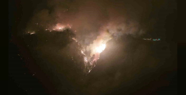 Yangın bölgesinde parçalar halinde devam eden alevler, gece saatlerinde dron ile havadan görüntülendi. Görüntüler, ekiplerin yangın noktalarına karadan müdahalelerinin devam ettiğini gösteriyor.