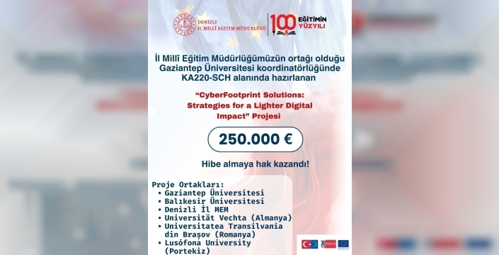 Denizli İl Milli Eğitim Müdürlüğü, 250 bin Euro bütçeli ‘CyberFootprint Solutions’ adlı Erasmus+ projesinde yer alarak, dijital sürdürülebilirlik kültürünün geliştirilmesine katkıda bulunacak. Proje, Türkiye, Almanya, Romanya ve Portekiz'den kurumların iş