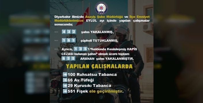 Diyarbakır ve ilçelerinde eylül ayında yapılan güvenlik operasyonları kapsamında, Asayiş Şube Müdürlüğü ve diğer polis ekiplerince yürütülen çalışmalarda 432 kişi gözaltına alındı. Bu şahıslardan 161'i tutuklanarak cezaevine gönderildi. Ayrıca, kesinleşmiş hapis cezası bulunan 135 kişi de dahil olmak üzere, toplam 635 aranan şahıs yakalandı.