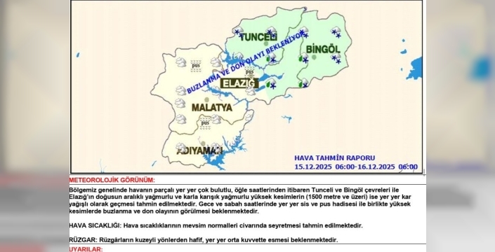 Meteoroloji 13. Bölge Müdürlüğü'nün açıklamasına göre, bölge genelinde havanın parçalı ve yer yer çok bulutlu olması öngörülüyor. Özellikle öğle saatlerinden itibaren Tunceli ve Bingöl'ün çeşitli çevrelerinde ve Elazığ'ın doğu kesimlerinde aralıklı yağmur ve karla karışık yağmur görülecek. Yüksek kesimlerde ise yer yer kar yağışının etkili olması bekleniyor.