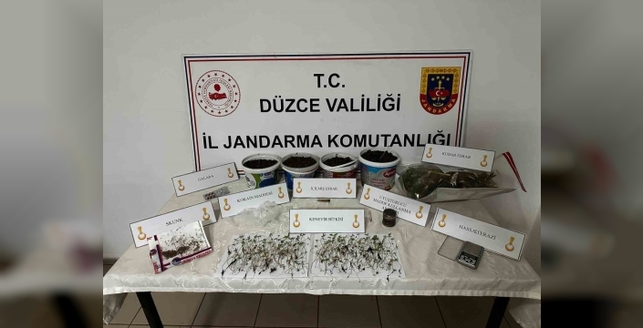 Düzce Cumhuriyet Başsavcılığı'nın koordinesinde gerçekleştirilen operasyonda, İl Jandarma Komutanlığı Narkotik Suçlarla Mücadele Şube Müdürlüğü ekipleri, Azmimilli Mahallesi'nde bir kişinin yasadışı kenevir ekimi yaptığını ve uyuşturucu madde imal edip sattığını belirledi. Eve yapılan baskında, 225 kök kenevir bitkisi, 247 gram kubar esrar, 9 gram kokain, 1 gram skunk, 6 adet uyuşturucu hap, 1 adet hassas terazi ve 3 adet uyuşturucu madde kullanma aparatı ele geçirildi.