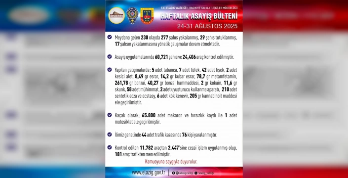 Elazığ'da 24-31 Ağustos 2025 tarihleri arasında 230 asayiş olayı yaşandı. 277 kişi yakalanırken, 29 kişi tutuklandı; ayrıca 44 trafik kazasında 76 kişi yaralandı.