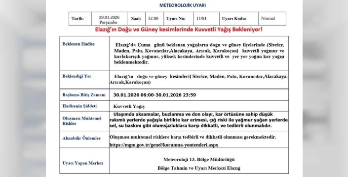 Uyarıya göre, Sivrice, Maden, Palu, Kovancılar, Alacakaya, Arıcak ve Karakoçan ilçelerinde kuvvetli yağmur ve karla karışık yağmur bekleniyor. Yüksek kesimlerde ise yoğun kar yağışı tahmin ediliyor. Bu durum, bölgedeki yaşamı ve ulaşımı doğrudan etkileyecek ciddiyette.