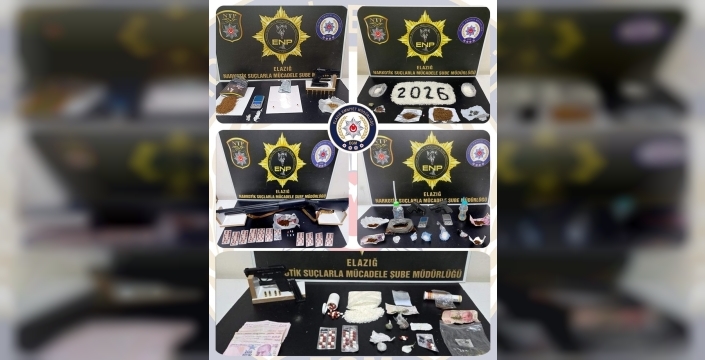 Elazığ Cumhuriyet Başsavcılığı'nın koordinasyonunda, İl Emniyet Müdürlüğü Narkotik Suçlarla Mücadele ve Asayiş Şube Müdürlükleri tarafından yürütülen titiz çalışmalar neticesinde, piyasaya sürülmek üzere olan yüklü miktarda uyuşturucu madde ve çok sayıda ruhsatsız silah ele geçirildi. Operasyonlar kapsamında 1 kilo 221 gram metamfetamin, 527 gram sentetik kannabinoid, 117 gram kokain, 635 adet sentetik ecza ve 49 gram esrarın yanı sıra 3 adet hassas terazi de bulundu.