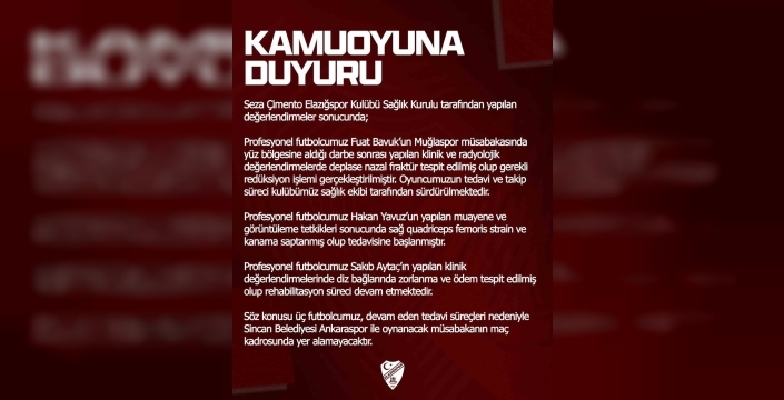 Elazığspor sağlık heyetinin yaptığı yazılı açıklamada, profesyonel futbolcu Fuat Bavuk'un Muğlaspor müsabakasında yüzüne aldığı darbe sonrası yapılan değerlendirmelerde deplase nazal fraktür tespit edildiği, gerekli redüksiyon işleminin yapıldığı belirtildi. Fuat'ın tedavi süreci kulüp sağlık ekibi tarafından takip edilecektir. Ayrıca, Hakan Yavuz'un muayene ve görüntüleme tetkiklerinde sağ quadriceps femoris strain ve kanama saptandığı, tedavisine hemen başlandığı ifade edildi. Sakıb Aytaç'ın ise diz bağlarında zorlanma ve ödem tespit edildiği, rehabilitasyon sürecinin devam ettiği bildirildi. Bu üç futbolcu, tedavi süreçleri nedeniyle Sincan Belediyesi Ankaraspor ile oynanacak maçta yer alamayacak.