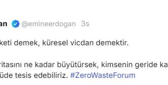 Emine Erdoğan, 17-19 Ekim tarihlerinde İstanbul'da düzenlenen 'Sıfır Atık Hareketi: İnsan, Mekan, Dönüşüm' temalı Uluslararası Sıfır Atık Forumu'na dair değerlendirmelerini sosyal medya üzerinden paylaştı. Bu küresel hareketin, vicdanın bir haritası olduğunu ve bu haritanın genişlemesinin, kimsenin geride kalmadığı bir dünya tesis etmek anlamına geldiğini vurguladı.