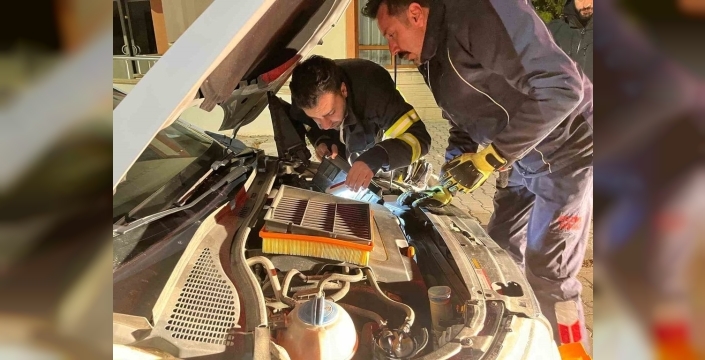 Erzincan'da araç motoruna sıkışan kedi, itfaiyenin hassas kurtarma operasyonuyla kurtarıldı