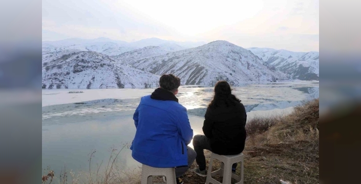 Erzincan'da baraj buzla kaplandı, balık kafesleri buz altında kaldı