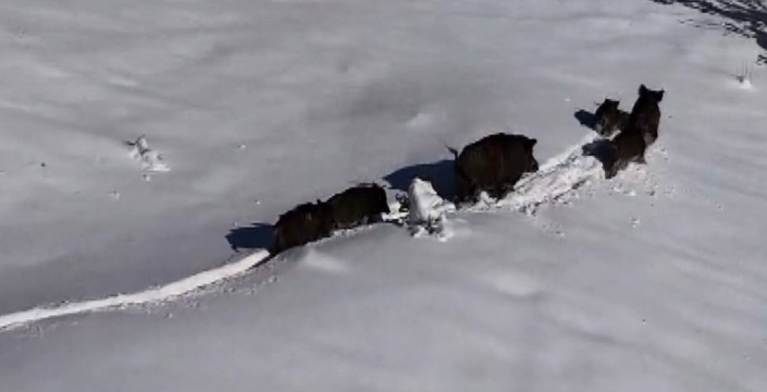 Erzincan merkeze bağlı Kalecik köyü civarında görülen yaban domuzu sürüsü, açık arazide kar üzerinde ilerlerken drone ile görüntülendi. Bölge sakinlerinden Murat Aydemir, karla kaplı alanlarda hareket eden domuzları fark edince drone ile takip etmeye başladı. Görüntülerde, kalın kar tabakası üzerinde koşan, bazen duraksayan ve yön değiştiren domuzların bir arada hareket ettiği anlar kaydedildi. Sürü, bir süre sonra dağlık alana doğru ilerleyerek gözden kayboldu.
