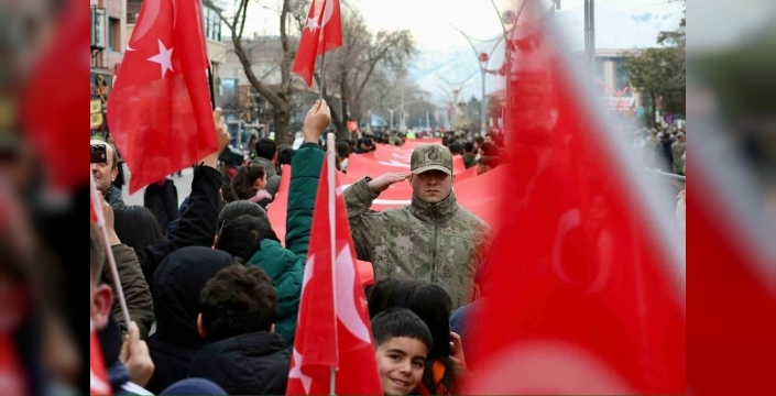 Erzincan il protokolü, öğrenciler ve vatandaşlar, Türk bayrakları eşliğinde şehrin Ordu, 13 Şubat, Fevzipaşa ve Halitpaşa Caddeleri üzerinden eş zamanlı olarak yürüyüşe geçti. Mehmetçikler ve vatandaşlar, omuzlarında ay yıldızlı bayraklarla Erzincan'ın merkezi noktası olan Dörtyol Meydanı'nda buluştu. Şehrin dört bir yanından gelen katılımcılar, birlik ve beraberlik mesajı vererek tek yürek oldu.
