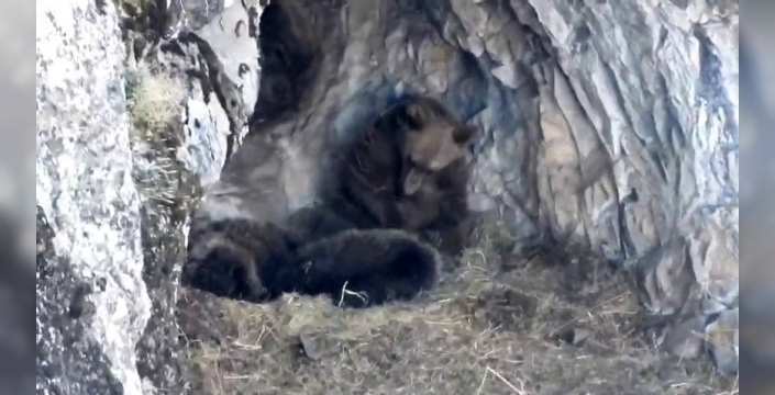 Görüntülerde, aile üyelerinden bir boz ayının sırtını mağara duvarına sürterek ve eliyle karnını kaşıyarak rahatlamaya çalıştığı anlar dikkat çekti. Bu sevimli ve doğal davranış, izleyenleri gülümsetti.