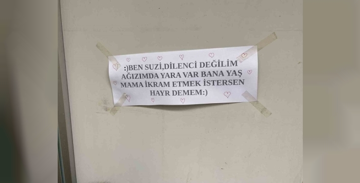 Eskişehir'de hayvansever esnaf, işletme önünde besledikleri kedi için duvara astıkları notla ilginç ve duygusal bir görüntü oluşturdu. Notta, kedinin ağzından yazılmış 'Ben Suzi, dilenci değilim. Ağzımda yara var, yaş mama ikram etmek istersen hayır demem' ifadeleri yer aldı.