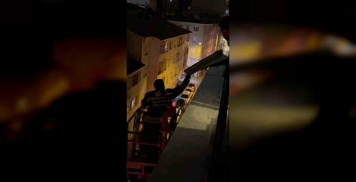 Binada yaşayanların durumu bildirmesi üzerine bölgeye itfaiye ekipleri sevk edildi. Karanlığa ve şiddetli rüzgara rağmen titiz bir çalışma yürüten ekipler, yüksekten sarkan ve her an düşme riski taşıyan metal parçayı kontrollü bir şekilde bulunduğu yerden aldı.