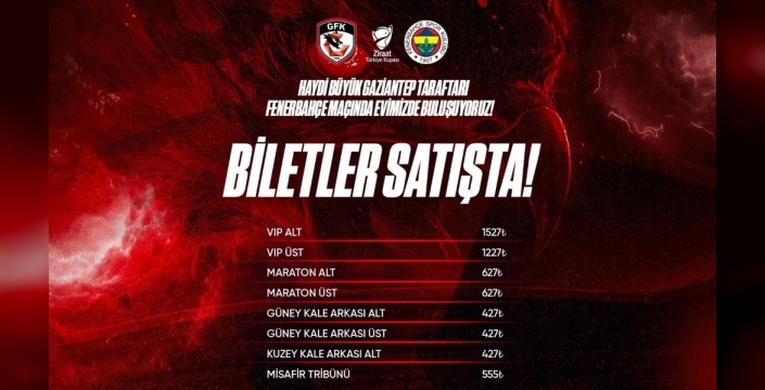 Gaziantep FK ile Fenerbahçe arasındaki Ziraat Türkiye Kupası maçı biletleri satışa çıktı. En düşük bilet 427 TL'den satılırken, en yüksek bilet bin 527 TL'ye ulaştı.
