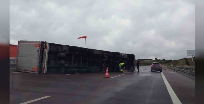 Fırtına otobanda tırı devirdi, sürücü mucizevi şekilde kurtuldu
