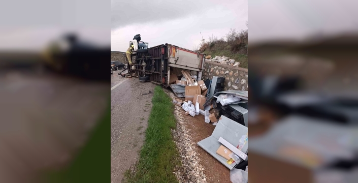 Balıkesir'in Gönen ilçesinde, olumsuz hava koşulları ve yağışın etkisiyle kayganlaşan yolda meydana gelen trafik kazasında bir kamyon devrildi. Kazada araç sürücüsü yaralanarak hastaneye kaldırıldı.