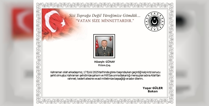 Milli Savunma Bakanlığı, görev başında kalp krizi geçirerek şehit olan Piyade Uzman Çavuş Hüseyin Günay için taziye mesajı yayınladı. 17 Eylül 2025 tarihinde yaşanan olay, ülke genelinde büyük üzüntü yarattı.