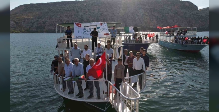 Şanlıurfa'nın Halfeti ilçesinde, sivil toplum kuruluşları ve turizmciler, teknelerle Fırat Nehri'nde buluşarak Sumud Filosu'na desteklerini gösterdi.