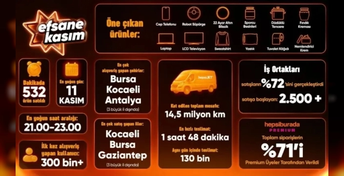 Hepsiburada'nın Efsane Kasım kampanyası rekorlarla dolu geçti. Siparişler %16 artarken, dakikada 532 ürün satıldı. Cep telefonu, küçük ev aletleri ve bilgisayar en popüler kategorilerdi.