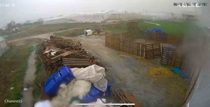 Zırlankaya Mahallesi'nde meydana gelen hortum, bir serayı saniyeler içinde parçaladı. Hortumun seraya ulaştığı anlar, çevredeki bir iş yerine ait güvenlik kamerasında anbean görüntülendi. Görüntülerde sağanak yağış sırasında hortumun serayı vurduğu ve naylonların savrulduğu net bir şekilde görüldü.
