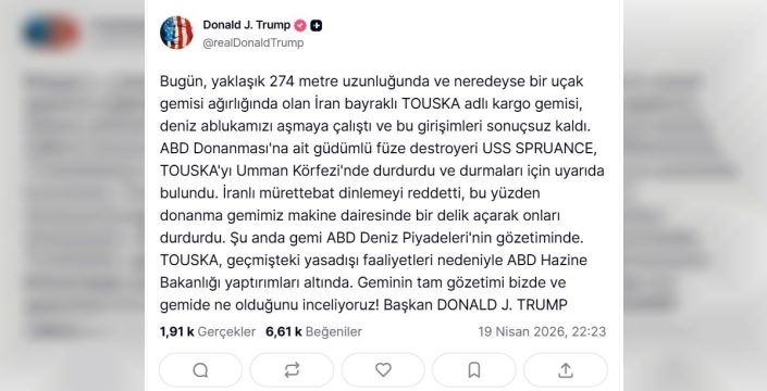 ABD Başkanı Donald Trump, sosyal medya üzerinden yaptığı bir açıklamada, İran bayraklı "TOUSKA" isimli kargo gemisinin Umman Körfezi'nde ABD deniz ablukasını aşmaya çalıştığını belirtti.