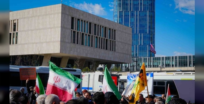 ABD'nin Ankara Büyükelçiliği önünde, kalabalık bir grup toplanarak protesto gösterisi düzenledi. İran bayrakları ve Hamaney'in fotoğraflarının taşındığı gösteride,