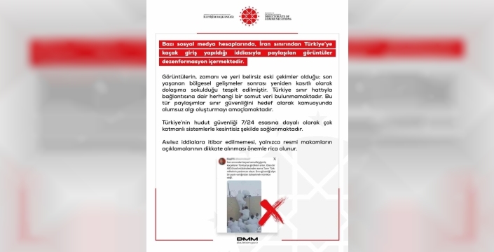 Cumhurbaşkanlığı İletişim Başkanlığı Dezenformasyonla Mücadele Merkezi (DMM), İran sınırından Türkiye'ye kaçak giriş yapıldığı iddiasıyla sosyal medyada paylaşılan görüntülerin dezenformasyon içerdiğini duyurdu.