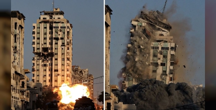 İsrail ordusu, işgal altındaki Gazze kentinde bulunan Mekke isimli çok katlı bir binaya hava saldırısı düzenledi. İsrail savaş uçakları, Filistinlileri güneye doğru zorla yerinden etmek amacıyla Gazze'de yoğun nüfuslu çok katlı binaları hedef almaya devam ediyor.